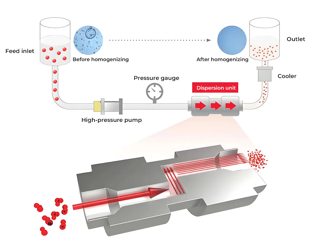 يتم دفع عينة السائل بسرعة عبر الفجوات الضيقة داخل وحدة التشتت تحت ضغط عالٍ. يؤدي الانخفاض المفاجئ للضغط إلى توليد سرعات فائقة جدًا، مسببة اضطرابًا شديدًا، وتكوّن التجاويف، وقوى القص، وتدفق نفاث، التي تفكك الجسيمات، وتقللها إلى حالة تجانس نانوية دقيقة وموحدة. بالإضافة إلى ذلك، يوفر وضع الطاقة مع المكثف الهيدروليكي ضغطًا ثابتًا يصل إلى 200 ميجا باسكال.